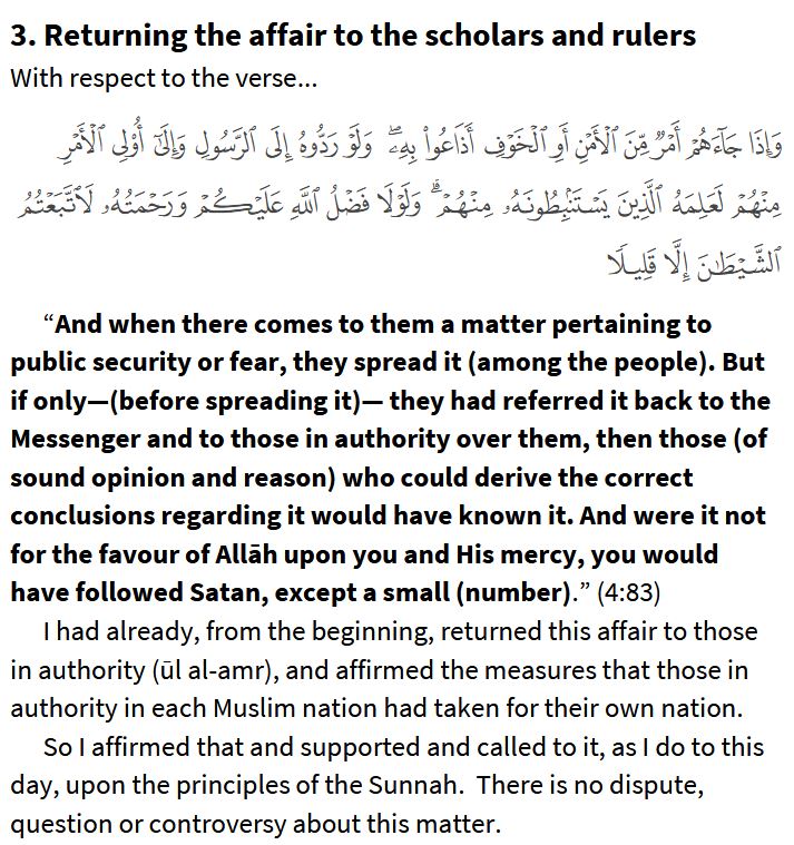 In short, I called for the correct application of this verse, and acknowledged that the affair returns to the rulers and scholars of every land, and that their views, choices and decisions should be respected.