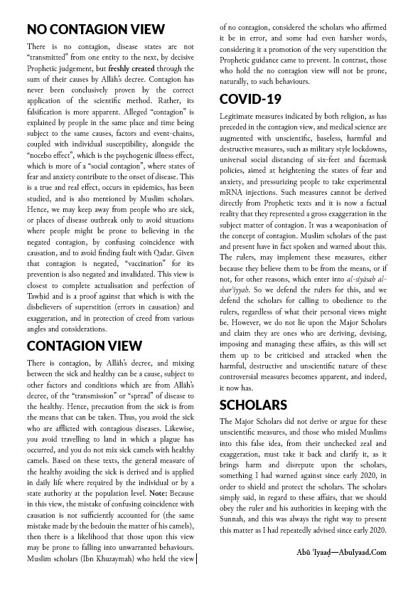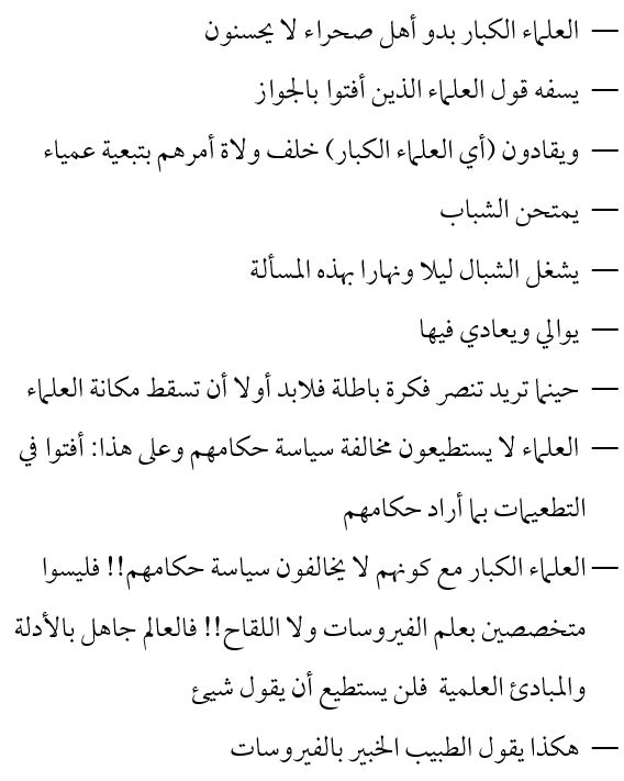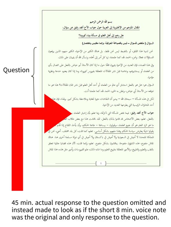 THE CRUX OF THE MATTER is that on the one hand there were ḥizbīs attacking Muslim rulers and authorities, particularly in Saudi Arabia, for imposing restrictions in early 2020, when the Covid-19 operation began. I spoke against them and refuted their claims. On the other hand, there were students of knowledge who swung to the other side and fell into exaggeration and began making unfounded claims, ascribing to scholars what they did not say, and committing academic crimes in knowledge-based issues, whether religious, or worldly (medical, scientific).