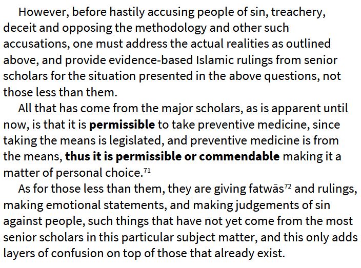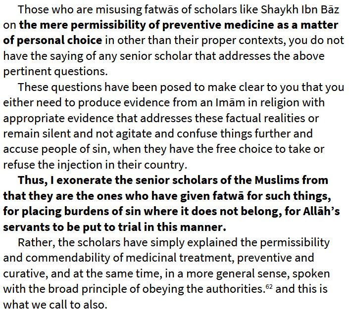 11 2021-11 — A harsh fatwā is elicited against those who advise with caution regarding the vaccine, which includes thousands of Muslim doctors, specialists and researchers all across the world who are bound by the laws of their own countries, not of Saudi Arabia, and who are duty-bound to fulfil their legal and professional obligations, which includes notification of risks to patients. They are judged by Shaykh ʿAbd Allāh al-Bukhārī to be following the way of the Muʿtazilah towards the scholars and accused of seeking fame and fortune. This fatwā was directed towards me primarily and was clearly understood to be so by everyone.