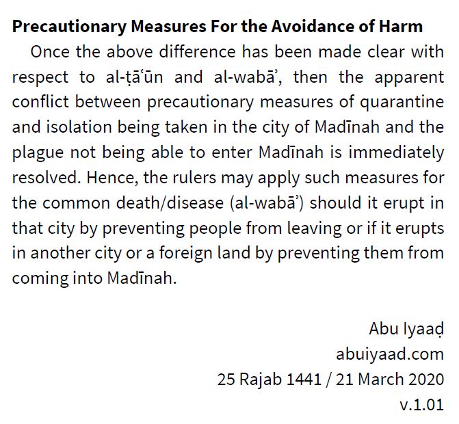 This is alongside our understanding that we are all agreed, that irrespective of our views, we should obey the authorities to maintain order and that we return to the scholars for fatāwā in relation to affairs of worship, dealings and rights that are affected by the pandemic measures.