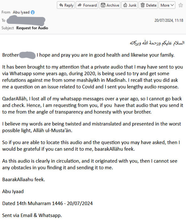 In summary, some people have spread allegations against me on social media based on private voice notes, a matter that could have been handled privately. Their approach, which grossly violates the Salafī methodology, proves that they have motives and agendas, emanating from hatred, and that they do not operate with good will.