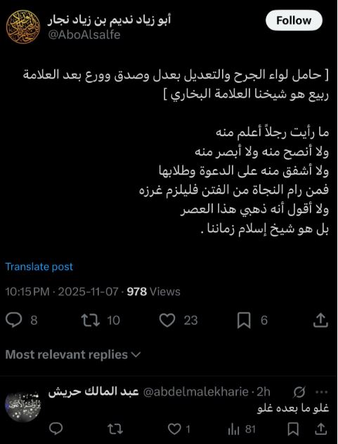 Now look at this betrayal: senior scholars today recommend our Shaikh ‘Abdullāh al-Bukhārī حفظه الله , among others. Shaikh ʿUbayd رحمه الله endorsed and encouraged (others) to take from him, Shaikh Rabīʿ حفظه الله said of Shaikh al-Bukhārī in one of his writings that he is among the senior Salafis—yet some people who have gone astray on the path and were not given success in their speech—equate the advice of our scholars to return to someone like Shaikh ‘Abdullāh al-Bukhārī with the flawed recommendations of al-Ma’ribī for ʿAli al-Halabī and Salīm al-Hilālī.