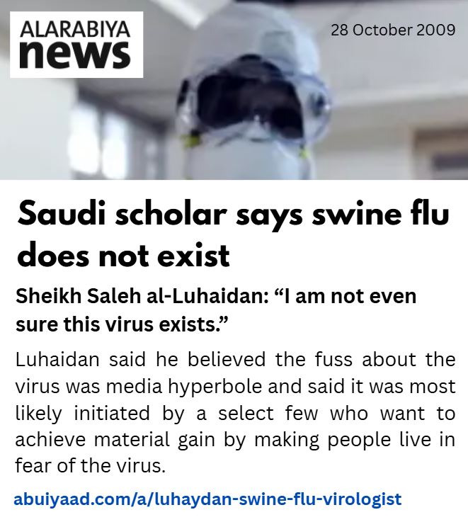 Shaykh Ṣāliḥ al-Luḥaydān (رحمه الله) cast doubt about the “Swine Flu” and the alleged virus, and he was totally correct in that. Though people may have fallen ill and died, a “Swine flu virus” is not needed to explain that.