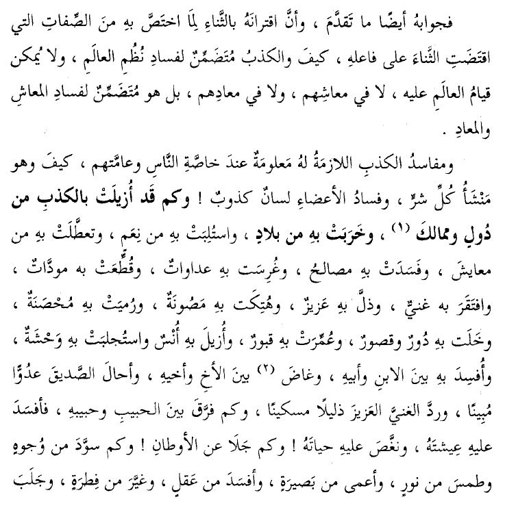LYING INHERENTLY CORRUPTS the orders of the world, and the world is unable to function upon it, not in their worldly life, nor the hereafter. Rather, it inherently corrupts the world and the hereafter. The inherent evils of lying are known to both the elite people and their common folk.