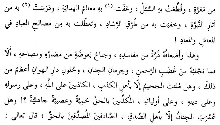 This and multiple times more is merely a speck among all of its corruptions and only a fly's wing of all of its harms and [apparent] benefits. Indeed, what it draws of the anger of al-Raḥmān and the deprivation of Paradise, and dwelling in the abode of disgrace is greater than that.