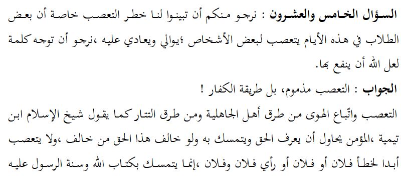 This bigotry partisanship is from the affairs of the Jahiliyyists, and from their deeds. As for the truthful Muslim, he must clear himself from partisanship and from the oppositions (that oppose) what Muḥammad (صلى الله عليه وسلم) came with. Partisanship is blameworthy, and no one shows partisanship save a fool or a mad person who suffers from a neurological disease.