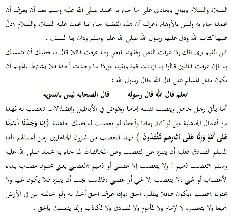 He does not show bigotry to the error of so-and-so, or the opinion of so-and-so, rather, he holds fast to the Book and the Sunnah of Allāh’s Messenger (صلى الله عليه وسلم), and he shows loyalty and enmity around what Muḥammad (صلى الله عليه وسلم) came with, and not to mere presumptions (awhām).