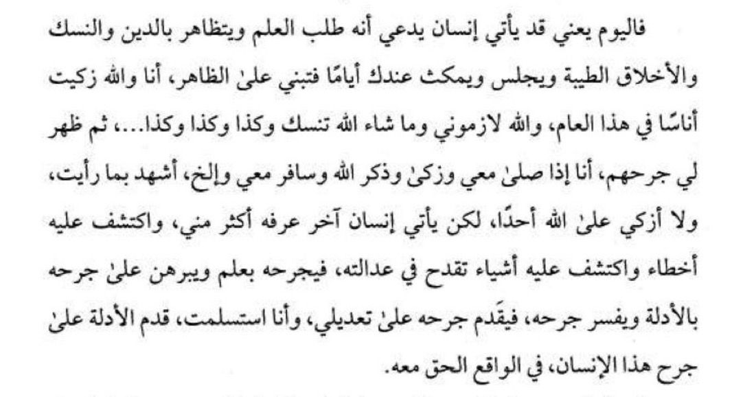 So today, a person may come and claim he sought knowledge and make a display of religiosity, devotion, good manners, and he sits and spends time with you for some days, so it is based upon what is apparent. By Allāh, I gave commendation (tazkiyah) for people this year, by Allāh, they accompanied me, and whatever Allāḥ willed, showing devotion [in worship and rituals] and so on.