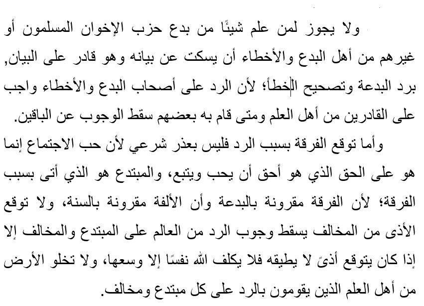 It is not permissible for the one who knows of the innovations of the Muslim Brotherhood or other groups who have deviant beliefs and errors to remain silent about them, when they have the ability to clarify, refuting innovation and correcting errors.
